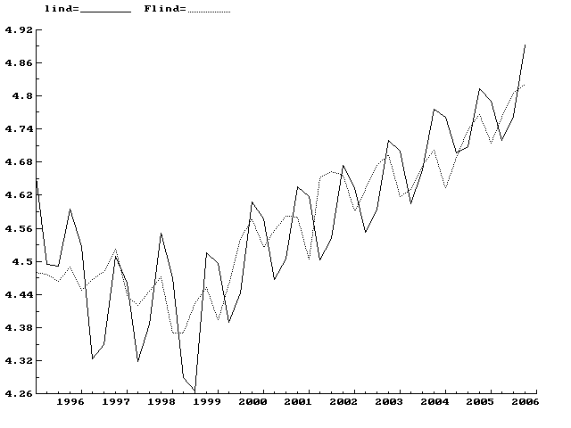 Рис.1. Индекс промышленного производства (lind=log(Ind)) и его расчет по модели (Flind) Влияние фактора реального обменного курса на динамику промышленного производства в России является, бесспорно, значимым. Этот фактор не был включен в долгосрочную коинтеграцию по простой причине: динамика реального обменного курса формируется в значительной степени под влиянием экспортных цен на нефть и приходится исключить его во избежание эффекта мультиколлинеарности. Вместе с тем укрепление рубля в реальном выражении оказывает весьма ощутимый макроэкономический эффект: снижение темпов промышленного производства в 2005 году вдвое по сравнению с 2004 годом. Чтобы эконометрически точно рассчитать этот эффект, необходимо расширить построенную коинтеграционную зависимость до модели коррекции регрессионных остатков. Эта модель, построенная для показателя темпов роста промышленного производства, имеет вид (в скобках – t-статистики Стьюдента) :
