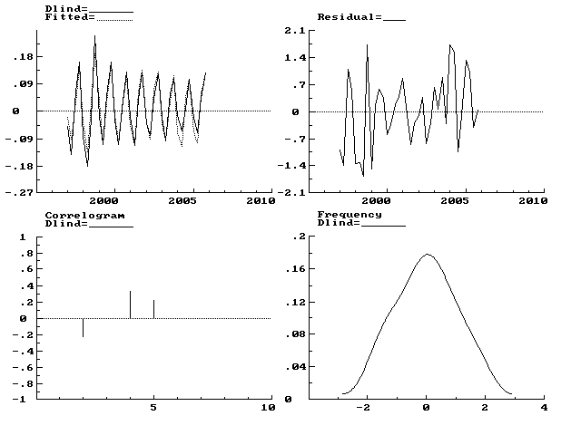 Dlog(Ind) = 0.058 + 0.261 Dlog(Ind(-1)) - 0.178 Rlog(Ind(-1)) + 0.126 Dlog(er(-1)) - (2.85) (2.09) (-2.48) (2.43) - 0.119 Seas - 0.149 Seas(-1) + 0.059 Seas(-3), (-3.02) (-6.04) (2.34) где D - оператор взятия последовательных разностей прологарифмированного динамического ряда, т.е. фактически перехода к темпу изменения соответствующего показателя; R - обозначение ряда регрессионных остатков; er - реальный обменный курс доллара; Seas - сезонная дамми-переменная. Показатели качества этой модели: R2=0.92, критерий Бройша-Годфри на автокорреляцию остатков высокого порядка: AR 1-3F(3,33) = 1.82 - подтверждают ее приемлемое качество. Проведенный эконометрический анализ позволяет сделать следующие выводы: