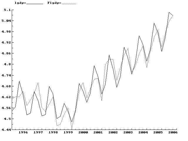 Рис.3. Индекс реального ВВП (lgdp=log(GDP)) и его расчет по модели (Flgdp) Показатели качества этой зависимости: R2=0.90, DW=1.81. Проверка ряда регрессионных остатков этой зависимости на стационарность с использованием теста Дэвидсона-Маккиннона подтвердила гипотезу стационарности. Таким образом, долгосрочный коэффициент эластичности индекса промышленного производства по фактору экспортных цен на нефть составляет +0.17; по фактору дефлированных тарифов на электроэнергию: -0.12; по фактору реальных инвестиций в основной капитал: +0.26; по фактору налоговой нагрузки на реальный сектор: -0.10, по фактору расходов на социальную политику: +0.17. Эта зависимость подтверждает тезис о том, что снижение уровня базовой налоговой нагрузки на экономику (конкретно, снижение доли налога на прибыль организаций в структуре доходов государственного бюджета) приводит к оживлению экономической конъюнктуры и росту реального ВВП. Рост доли расходов на социальную политику также положительно сказывается на динамике экономического роста в России. Для оценки влияния реального эффективного курса рубля на темпы роста ВВП коинтеграционная зависимость была расширена до модели коррекции регрессионных остатков: Dlog(GDP) = -0.081 + 0.284 Dlog(GDP(-1)) - 0.154 Rlog(GDP(-1)) - 0.072 Dlog(rer(-1)) + (-14.48) (4.35) (-2.51) (-2.56) + 0.156 Seas(-1) - 0.208 Seas(-2), (13.06) (-22.11) Показатели качества этой модели: R2=0.95, критерий Бройша-Годфри на автокорреляцию остатков высокого порядка: AR 1-3F(3,33)=1.87 – подтверждают ее приемлемое качество.