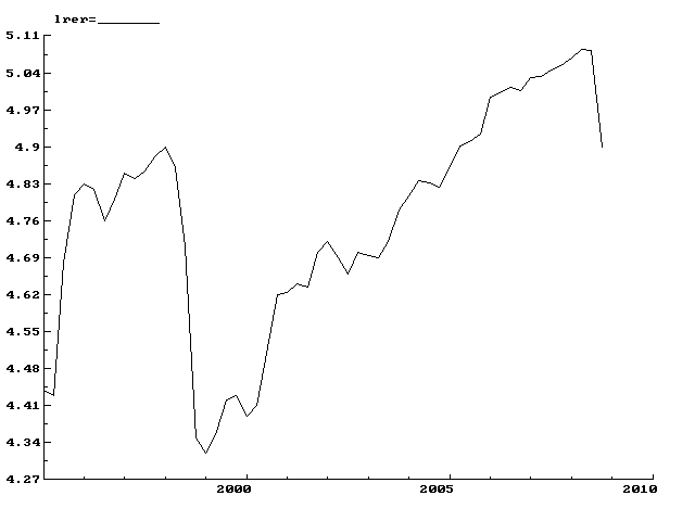 Сделаем несколько комментариев к приведенным графикам этих переменных. Бурный рост экспортных цен на российскую нефть (woil)  в 2003-2007 гг. приводил к укреплению рубля в номинальном и реальном выражении (lrer=log(rer)). Осенью 2008 года ситуация сменилась на противоположную: «схлопывание» пузыря на рынке нефти (по некоторым оценкам на 1 тонну реальной нефти приходилось 50 тонн «бумажной» нефти в виде акций и финансовых деривативов) привело к падению мировых и экспортных цен на нефть более чем на 50%  в сравнении с июлем 2008 года. В результате ЦБ России был вынужден девальвировать рубль относительно доллара и евро.
