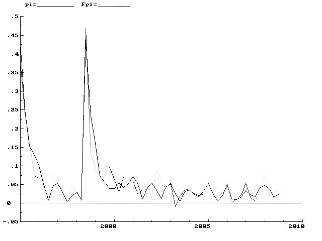 Dlog(rinfed) = 0.061 - 0.7542 Rlog(rinfed(-1)) - 0.9406 Dlog(er) - 0.243Seas
