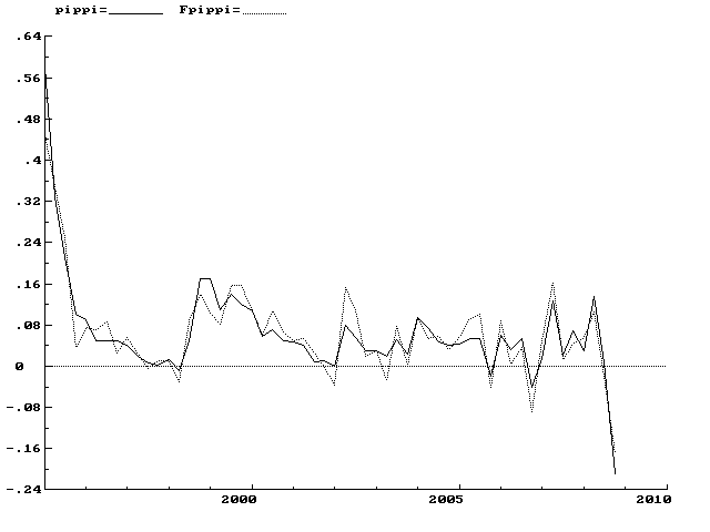 Рис. 7. Темп инфляции в промышленности (pippi) и его расчет по модели (Fpippi)