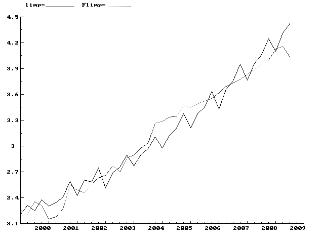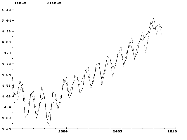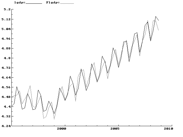 Рис.8. Индекс реального ВВП (lgdp=log(GDP)) и его расчет по модели (Flgdp)