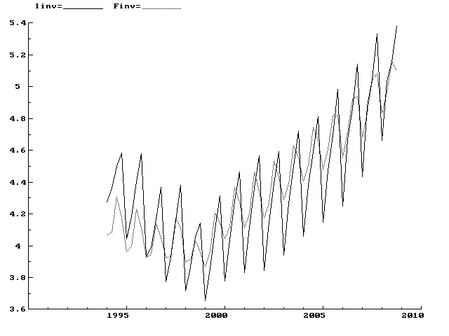 Рис.9 Индекс инвестиций в основной капитал (linv=log(Inv)) и его расчет по модели        (Flinv)