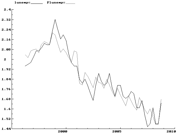 Рис.15. Логарифм показателя общего количества безработных (lunemp=log(Unemp) и его расчет по модели (Flunemp)