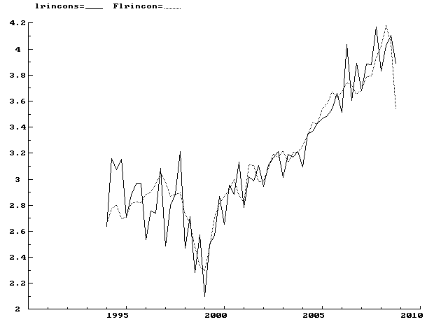Рис. 17. Реальные доходы консолидированного бюджета (lrincons=log(rincons)) и их расчет по модели (Flrincons)
