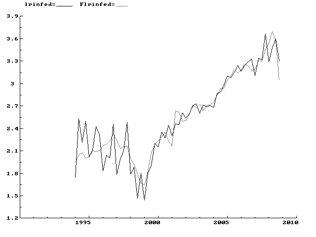 Рис.18. Реальные доходы федерального бюджета (lrinfed=log(rinfed)) и их расчет по модели (Flrinfed)