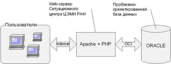 2. Функциональная структура Ситуационного центра. Исходя из целей и задач, описанных выше, для реализации сайта Ситуационного центра ЦЭМИ РАН были определены инструменты разработки и построена функциональная схема (рис. 1). Страницы сайта созданы с помощью языка разработки Web-приложений PHP (Hypertext Preprocessor) [2]. Соответственно, запросы пользователей обрабатываются Web-сервером Apache [3], который интерпретирует PHP-коды в HTML. Информация о моделях, значениях экономических показателей, результатах расчетов и т.д. хранится в проблемно-ориентированном хранилище данных, реализованном в СУБД Oracle [4]. Взаимодействие PHP с хранилищем данных осуществляется посредством OCI-библиотек (Oracle Call Interface), входящих в стандартную поставку PHP. Отметим, что такие программные инструменты как Apache и PHP распространяются свободно. Что касается Oracle, то эта СУБД является дорогостоящим средством, предназначенным для разработки промышленных баз данных. Однако в 2006 г. компания Oracle выпустила бесплатную версию Oracle Database 10g Express Edition (далее Oracle XE), имеющую следующие основные ограничения: Oracle XE использует только один процессор сервера, не более 1Gb оперативной памяти и позволяет хранить не более 4Gb пользовательских данных.