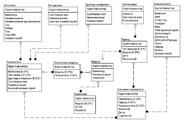 Очевидно, что версия с подобными ограничениями не удовлетворяет крупным промышленным проектам, но для решения задач, подобных нашей, является удобным и гибким инструментом. Логическая модель базы данных (схема сущность-связь) [5] приведена на рис. 2. Данная схема наглядно изображает хранение информации внутри базы данных. Сущностями, несущими основную смысловую нагрузку, являются «Модель», «Показатель» (переменная) и «Значение показателя». Все сущности имеют атрибут «Идентификатор», который однозначно идентифицирует сущность среди множества других аналогичных объектов. Под типом периода в текущей реализации понимается день, неделя, месяц, квартал либо год. Сущность «Период» соответствует не интервалу дат, а конкретной дате наблюдения (например, первому числу месяца, если данные носят ежемесячный характер). Приведенная структура позволяет хранить не только числовые значения показателей, но и любые другие (например, логические либо строковые), что отражено в наличии сущности «Тип данных» в логической модели.