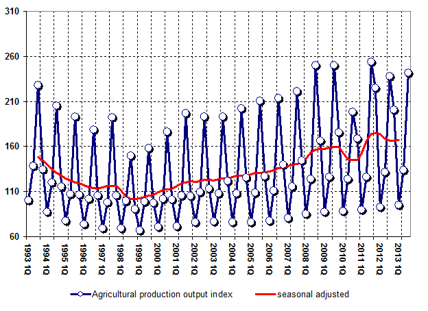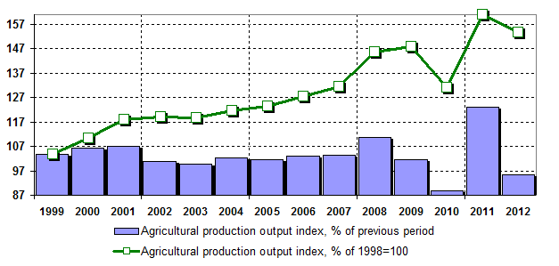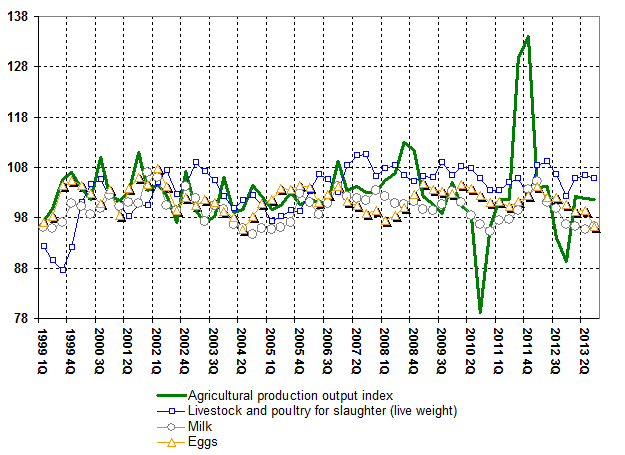 Production Output Index of agricultural production at all established types is 101.6% for 3-rd quarter of 2013. Historically, it was equal 94.0% during 3 quarter of 2012. Livestock and poultry for slaughter (live weight) 5.8% of growth (6.6% of growth for 3-rd quarter of 2012), Milk 3.7% of decrease (0.2% of decrease for 3-rd quarter of 2012), Eggs 3.8% of decrease (2.0% of growth for 3-rd quarter of 2012).