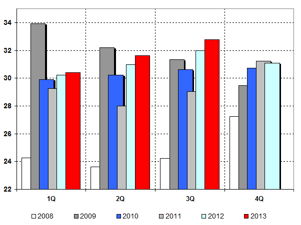 Exchange Averaged (for period) nominal exchange rate of US dollar is 32.79 ruble for 1 unit of currency for the 3-rd Quarter of 2013 (32 ruble for 1 unit of currency for the corresponding period of 2012).