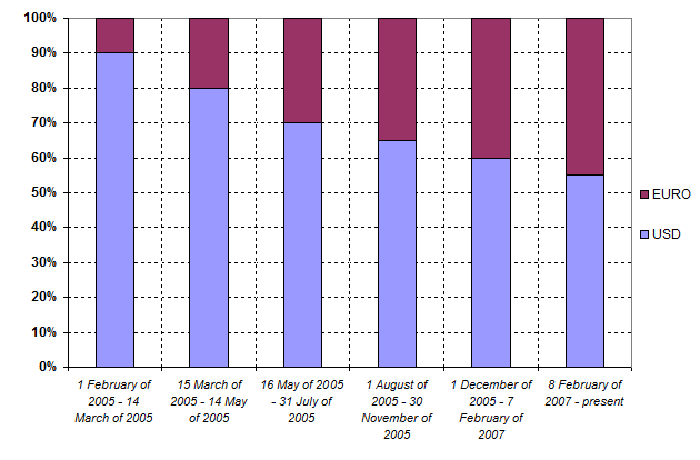 Bank of Russia dual-currency basket structure in retrospective (% of foreign currency in basket)