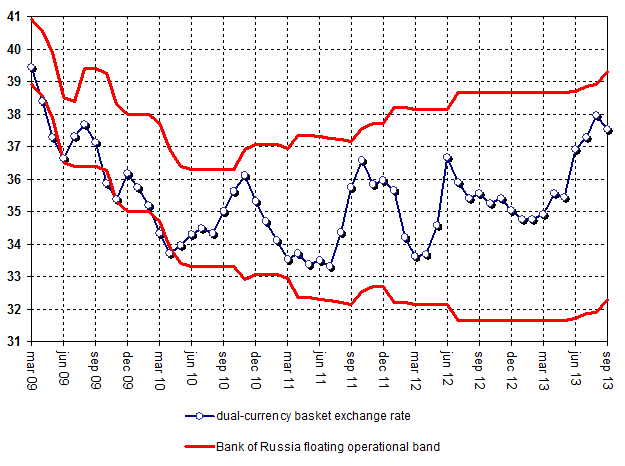 Dynamics of dual-currency basket exchange rate in comparison with boundaries of Bank of Russia floating operational band (exchange rate of dual-currency basket according to its structure)