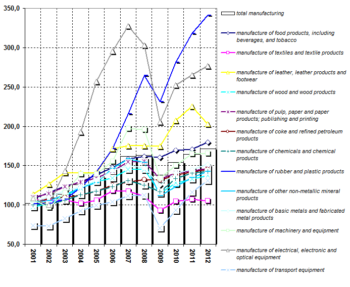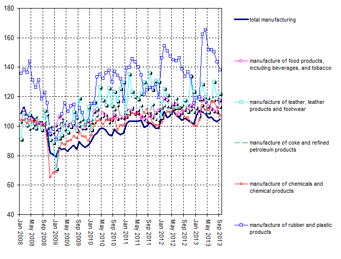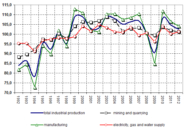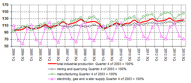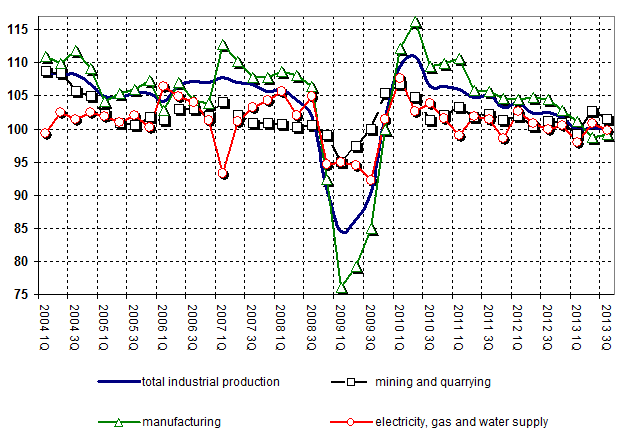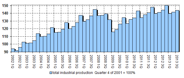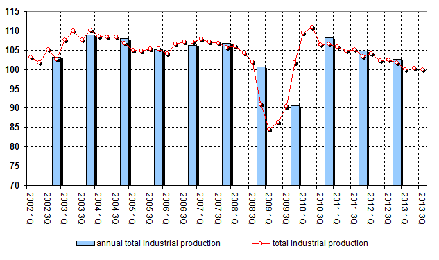 Production Total industrial production equals 101.7% of previous period for 3-rd Quarter of 2013 (102.1% for 3-rd Quarter of 2012). Annual index - 99.9% (% of corresponding period of previous year). Historically, annual index was 102.5% for 3-rd Quarter of 2012.
