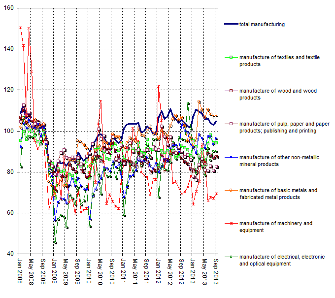 Manufacturing output index equals 103.4% of previous period or 99.2% of corresponding period of previous year (annual) for 3-rd Quarter of 2013. Historically for 2012, indices are 103.1% and 104.5% correspondingly.