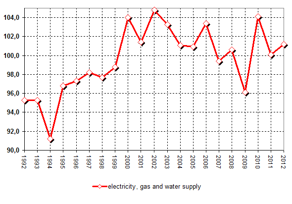 Electricity, gas and water supply output index is 89.3% of previous period or 99.8% of corresponding period of previous year (annual) for 3-rd Quarter of 2013. For 2012 - 89.8% and 100.0% correspondingly.