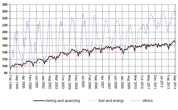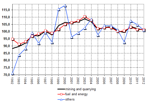 Mining and quarrying output index equals 101.9% of previous period or 101.4% of corresponding period of previous year (annual). Historically for 2012, indices are 102.5% and 101.2% correspondingly.