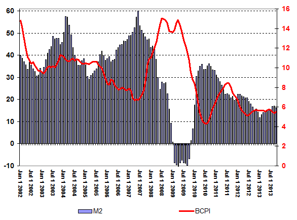 M2 Monetary Aggregate Dynamics in comparison with Base (Monetary) Consumer Price Index (% of corresponding period of previous year)