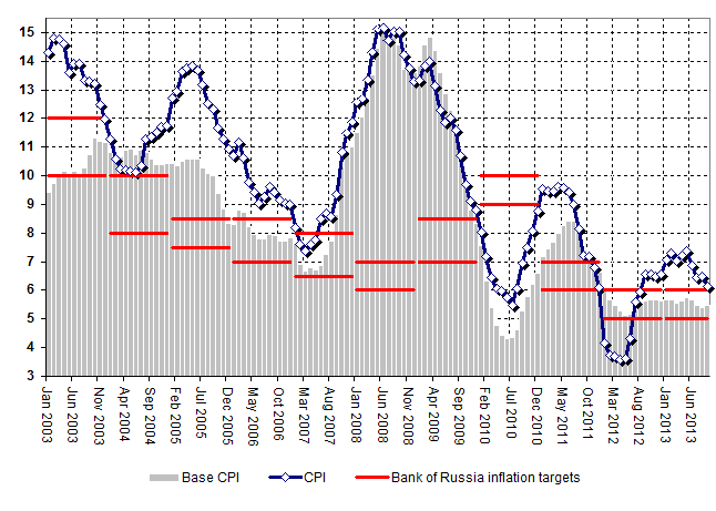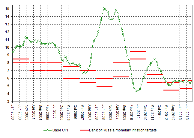 Dynamics of consumer price indices in Russia in comparison with Bank of Russia inflation targets (% of corresponding period of previous year )