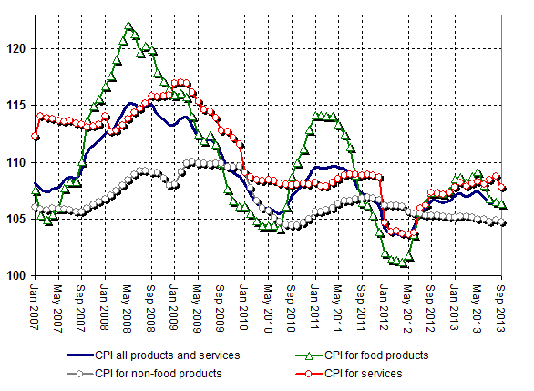 Dynamics of consumer price indices in Russia for all products and services, food products, non-food products, services (% of corresponding period of previous year )