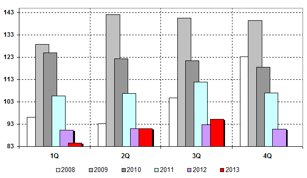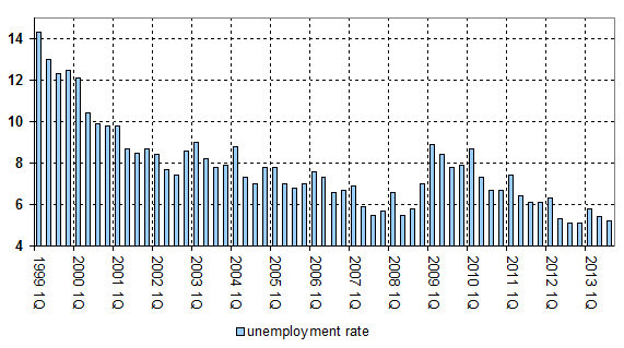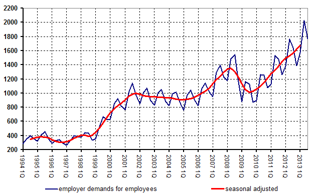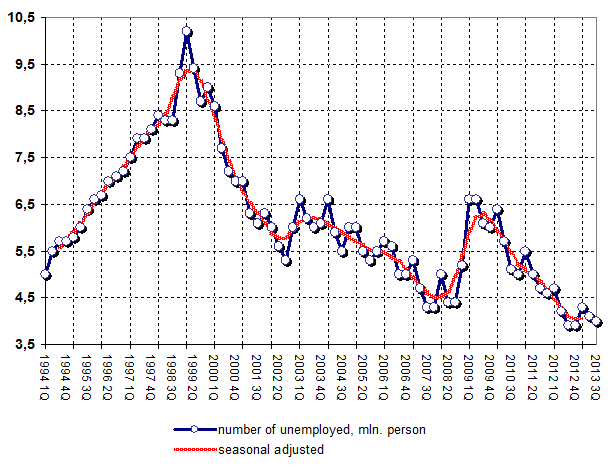 Market Number of employed population in economy in Russia equals 72.0 mln. person for 3-rd quarter of 2013. Historically, it was 72.5 mln. person for 3-rd quarter of previous year. Total number of unemployed is 4.0 mln. person (3.9 mln. person for 3-rd quarter of 2012). Unemployment rate equals 5.2% (5.1% for 3-rd quarter of 2012). Number of unemployed registered at state employment service - 916 thou. person (1058 thou/ for 3-rd quarter of 2012). 747 thou. person receive unemployment benefits (865 thou. for previous year).
