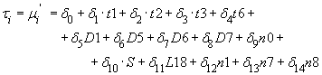 где t1, t2, t3, t6 — булевы переменные, равные 1, если событие происходит в течение часа соответственно с 9.00 до 10.00, с 10.00 до 11.00, с 11.00 до 12.00 и с14.00 до 15.00 и равны нулю в противоположном случае; D1, D5, D6, D7 — булевы переменные, равные 1, если событие происходит в понедельник, пятницу, субботу и воскресенье соответственно, и равны нулю в противоположном случае; n0 — булева переменная, равная 1 для событий с нулевым объемом реализации. В нашей статистике имеется пять событий с нулевым объемом реализации. Объяснить их какими-либо закономерными процессами пока невозможно. Но влияние этих событий на построение границы эффективности есть. Для того, чтобы учесть это влияние, введена переменная n0; S — расстояние от центра города до производственного участка, измеренное в км; L18 — булева переменная, равная 1, если событие происходит при количестве персонала на производственном участке свыше 18 человек, равна нулю в противоположном случае; n1, n7, n8 — булевы переменные, равные 1, если событие происходит на 1-ом, 7-ом и 8-ом участках, иначе равны нулю; Pl — булева переменная, равная 1, если событие происходит на площади производственного участка свыше 1400 кв. м, иначе — равна нулю. Построим для нашего примера модель 3.1 производственного потенциала с одним основным производственным фактором. Результаты расчетов методом максимального правдоподобия для одного основного производственного фактора представлены в следующей таблице 3. Таблица 3.