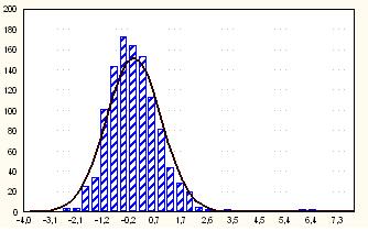 При проверке гопотезы о нормальности распределения остатков получена следующая диаграмма, где по оси абсцисс показано значение ошибки, а по оси ординат – число наблюдений.
