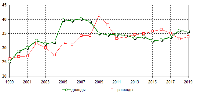 Рис.1 Динамика доходов и расходов консолидированного бюджета (в % к показателю ВВП в текущих ценах )