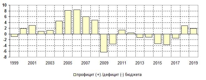 Исполнение бюджета РФ Доходы консолидированного бюджета составили 39110,3 млрд. рублей по итогам 2019 года, расходы составили 36995,3 млрд. рублей за аналогичный период, таким образом профицит бюджета составил 2115,0 млрд. рублей или 1,9% ВВП. Для справки, в 2018 году доходы бюджета за рассматриваемый период составили 37320,35 млрд. рублей, расходы 34284,71 млрд. рублей, профицит в размере 3035,64 млрд. рублей или 2,9% ВВП.