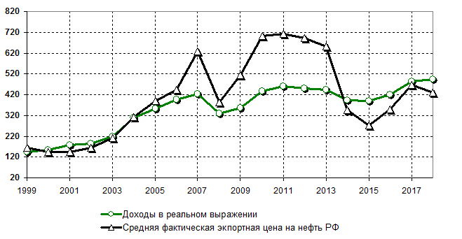 (доходы в % к базовому 1999 году, скорректированные на уровень инфляции; цена на нефть в % к уровню 1999 года)