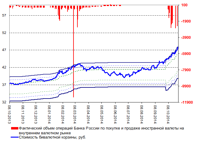 Рис.8 Параметры валютной политики ЦБ России начиная с октября 2014 по ноябрь 2014 (объем интервенций - млн. долларов США, на графике приведены операционные интервалы)