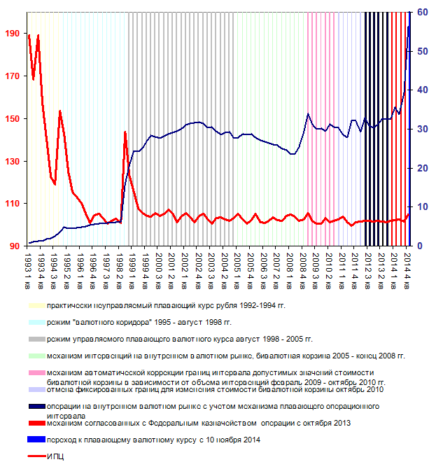 Рис.10 Валютная политика Банка России в историческом разрезе (ИПЦ - в % к предыдущему периоду, официальный курс доллара США - руб. за 1 доллар США)