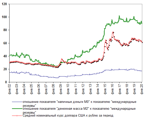 Рис.9 Динамика курса доллара США на фоне соотношений денежных агрегатов и международных резервов в России (руб. за 1 долл. США)