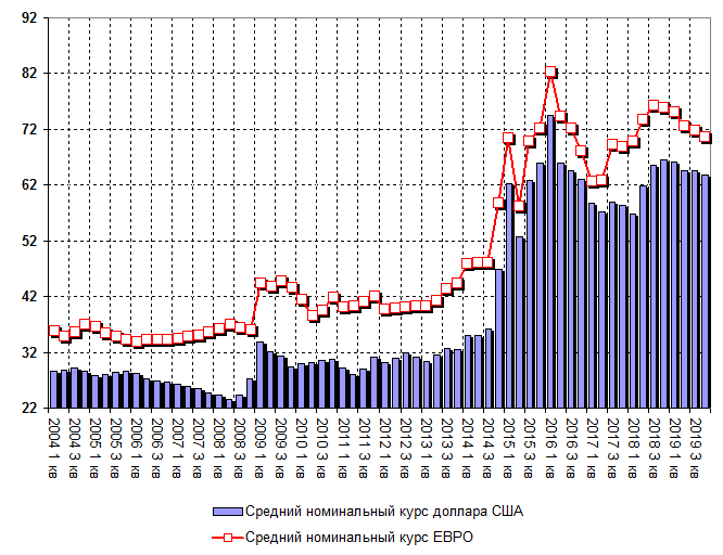 Валютные курсы Средний номинальный курс доллара США составил 64,73 руб. за 1 доллар США в 2019 году (62,66 руб. за 1 доллар США в 2018 году за аналогичный период).