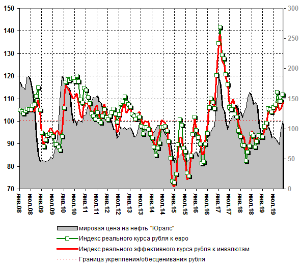 Рис.4 Динамика реального обменного курса рубля (обменный курс рубля - иностранная валюта за 1 рубль, показатели в %, месяц к месяцу предыдущего года)