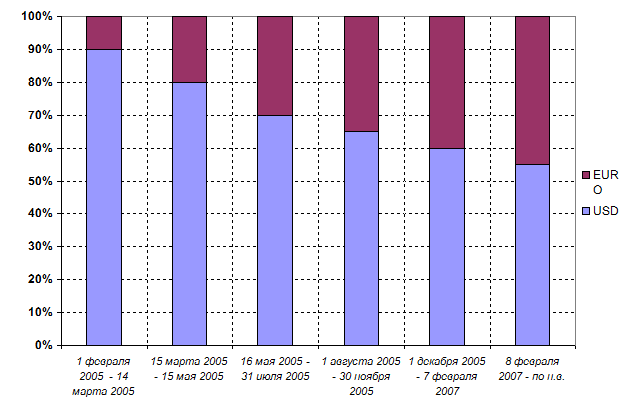 Рис.5 Структура бивалютной корзины ЦБ РФ в историческом разрезе (число единиц иностранной валюты в составе корзины)