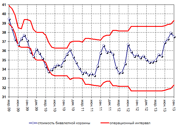 Рис.6 Динамика стоимости бивалютной корзины и границы плавающего операционного интервала курсовой политики ЦБ РФ (стоимость бивалютной корзины - исходя и текущей структуры корзины, рублей за единицу)