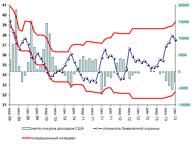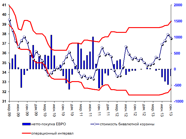 Рис.7 Динамика стоимости бивалютной корзины и границы плавающего операционного интервала курсовой политики ЦБ РФ на фоне валютных интервенций ЦБ РФ (стоимость бивалютной корзины - исходя и текущей структуры корзины, рублей за единицу, нетто-покупка долларов США - млн. долларов США, нетто-покупка ЕВРО - млн. ЕВРО)