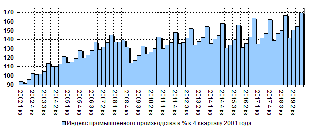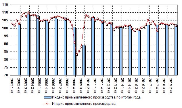 Промышленность Индекс промышленного производства составил 102,3% по итогам 2019 года в сравнении с 2018 годом. Для сравнения, в 2018 году данный показатель составлял 103,5%.