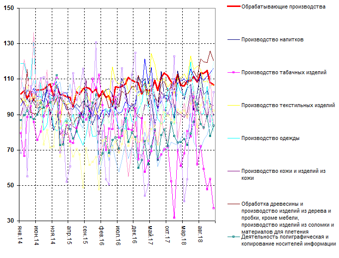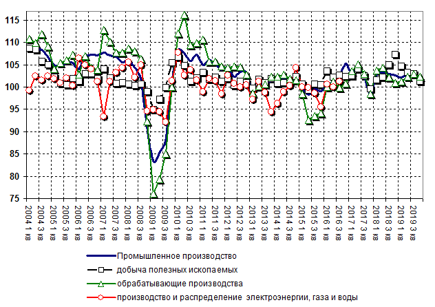 Рис.2 Динамика промышленного производства по секторам (в % к соответствующему периоду предыдущего года)