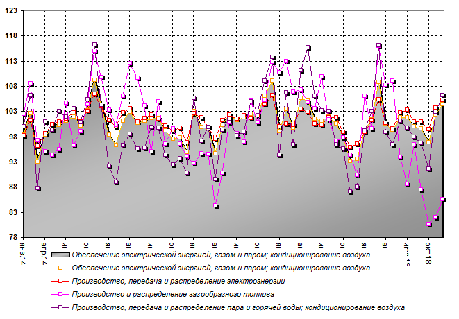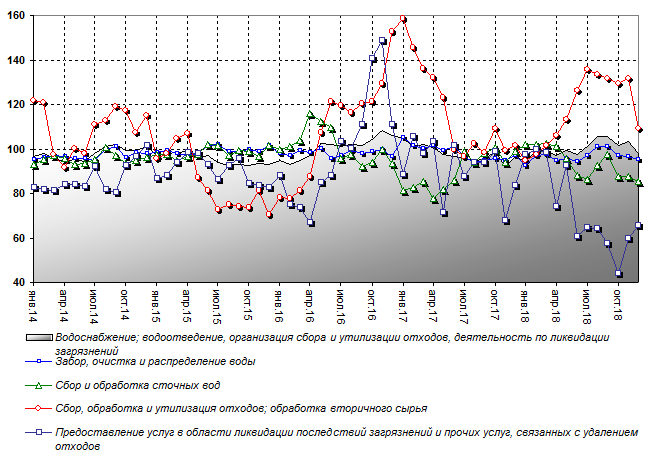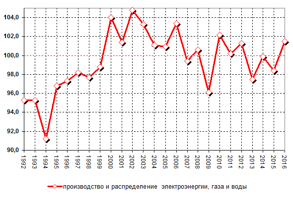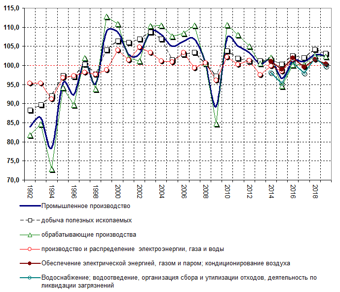 В связи с переходом на ОКВЭД2 при расчете индексов промышленного производства, в дальнейшем мониторинг осуществляется в отношении двух показателей: "Обеспечение электрической энергией, газом и паром; кондиционирование воздуха", "Водоснабжение; водоотведение, организация сбора и утилизации отходов, деятельность по ликвидации загрязнений", вместо прежнего показателя "Производство и распределение электроэнергии, газа и воды". Индекс производства по виду деятельности обеспечение электрической энергией, газом и паром; кондиционирование воздуха составил 100,0% по итогам 2019 года в сравнении с 2018 годом. Для справки, в 2018 году значения данного индекса составляло 102,2%. Индекс производства по виду деятельности водоснабжение; водоотведение, организация сбора и утилизации отходов, деятельность по ликвидации загрязнений составил 94,8% по итогам 2019 года в сравнении с 2018 годом. Для справки, в 2018 году значение индекса составило 102,9%.