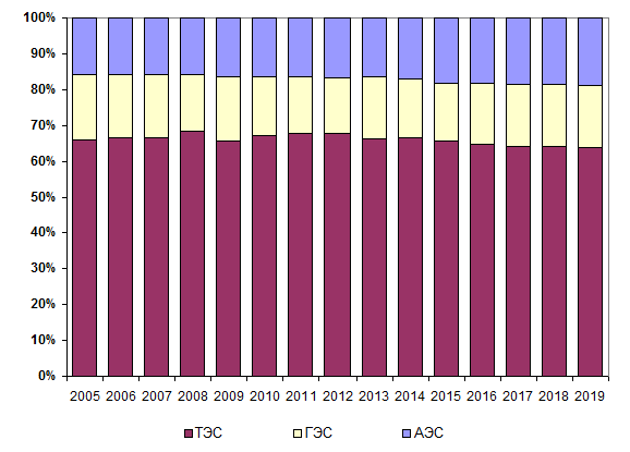 Рис.6 Структура электроэнергетики России в историческом разрезе (доля генерируемой электроэнергии в натуральном выражении от общего объема в %)
