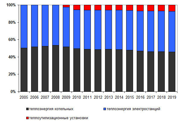 Рис.7 Структура тепловой энергетики в историческом разрезе (доля генерируемой тепловой энергии в натуральном выражении от общего объема в %)