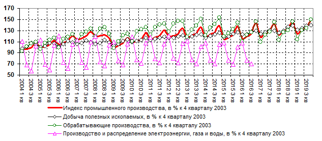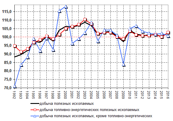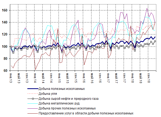 Индекс производства по виду деятельности "Добыча полезных ископаемых" составил 102,5% по итогам 2019 года относительно 2018 года. Для сравнения, в 2018 году наблюдалось значение индекса в размере 103,8%.