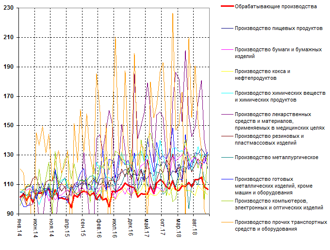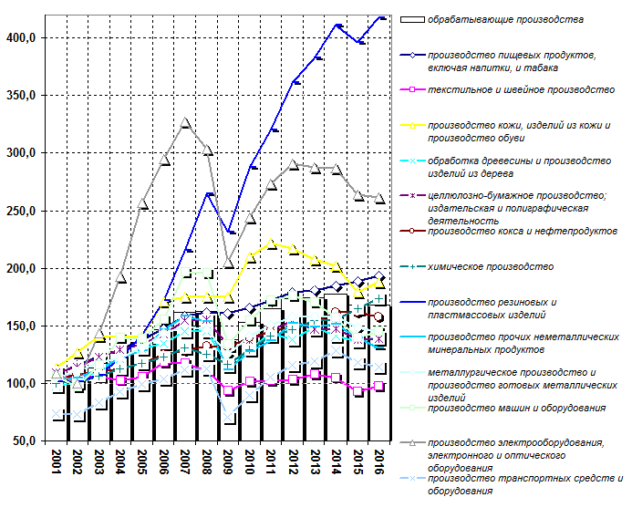 Рис.4 Динамика производства в обрабатывающей промышленности (в % к уровню 2000 года)