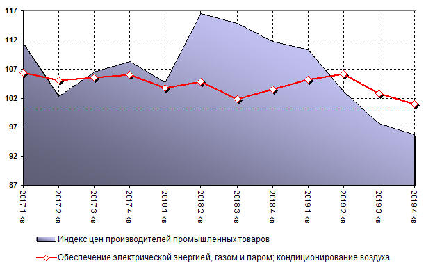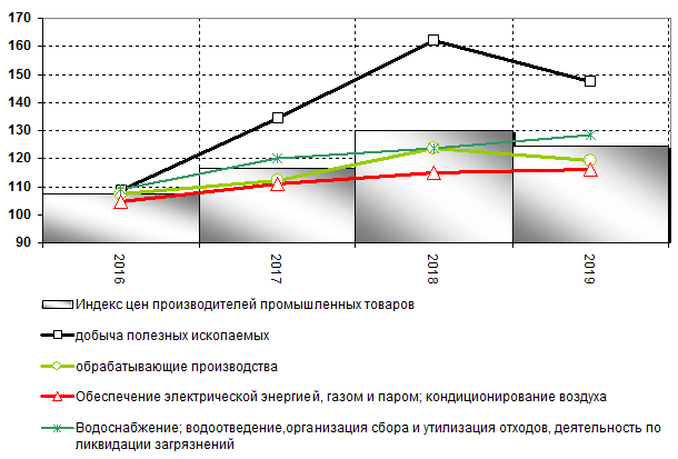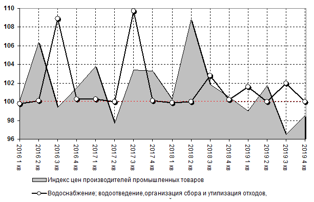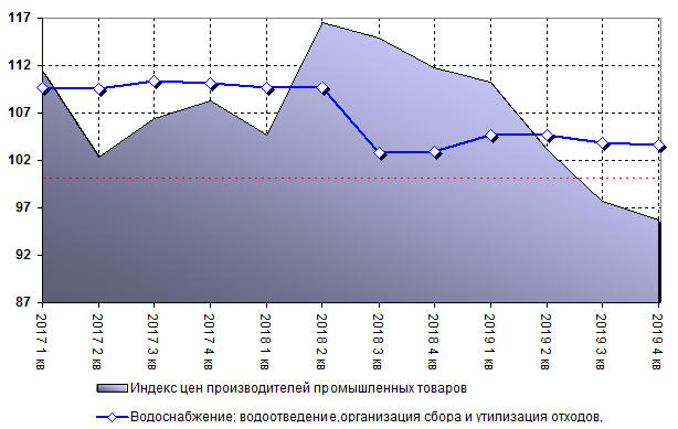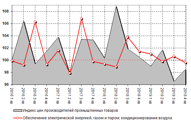 Индекс цен производителей в категории обеспечение электрической энергией, газом и паром; кондиционирование воздуха составил 101,1% по итогам 2019 года. Для сравнения, в 2018 году показатель составлял 103,5% Индекс цен производителей в категории водоснабжение; водоотведение, организация сбора и утилизация отходов, деятельность по ликвидации загрязнений составил 103,7% по итогам 2019 года. Для сравнения, в 2018 году показатель составлял 103,0%.