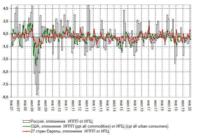 Рис.2 Отклонение индекса потребительских цен от индекса производителей промышленной продукции по выборке стран (в % к предыдущему периоду)