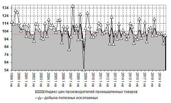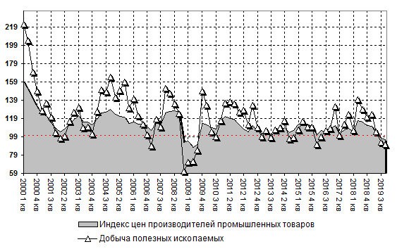 Индекс цен производителей в категории добыча полезных ископаемых составил 90,8% по итогам 2019 года относительно предыдущего периода. Для сравнения, в 2018 году показатель составлял 120,7%.