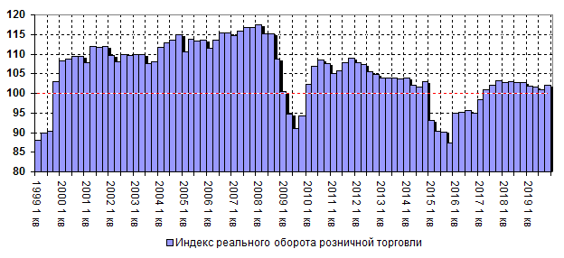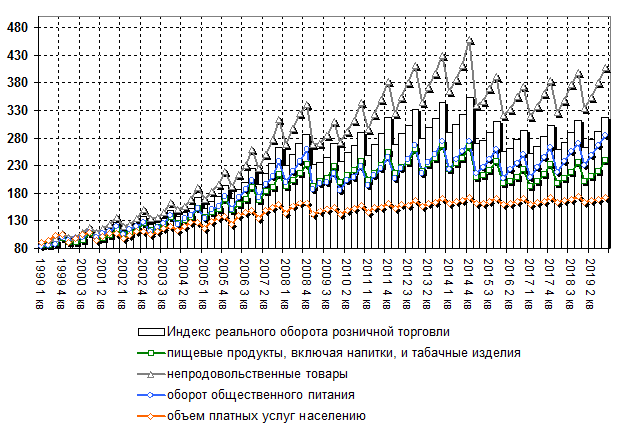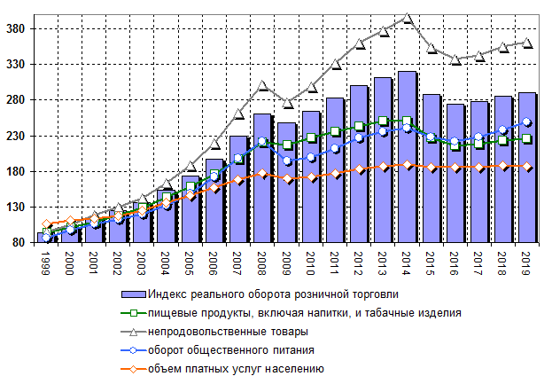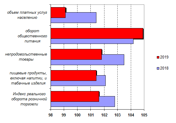 торговли Индекс оборота розничной торговли составил 101,6% по итогам 2019 года относительно предыдущего периода. Для сравнения, в 2018 году данный показатель составлял 102,8%. Оборот розничной торговли в реальном выражении в группе пищевых продуктов, включая напитки, и табачные изделия составил 101,4% в годовом выражении (102,1% в 2018). Оборот розничной торговли в реальном выражении в группе непродовольственных товаров составил 101,8% в годовом выражении (103,5% в 2018). Оборот общественного питания в реальном выражении составил 104,9% в годовом выражении (104,2% в 2018). Объем платных услуг населению в реальном выражении составил 99,1% в годовом выражении (101,4% в 2018).