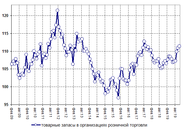 Рис.3 Динамика товарных запасов в организациях розничной торговли (в % к соответствующему периоду предыдущего года)
